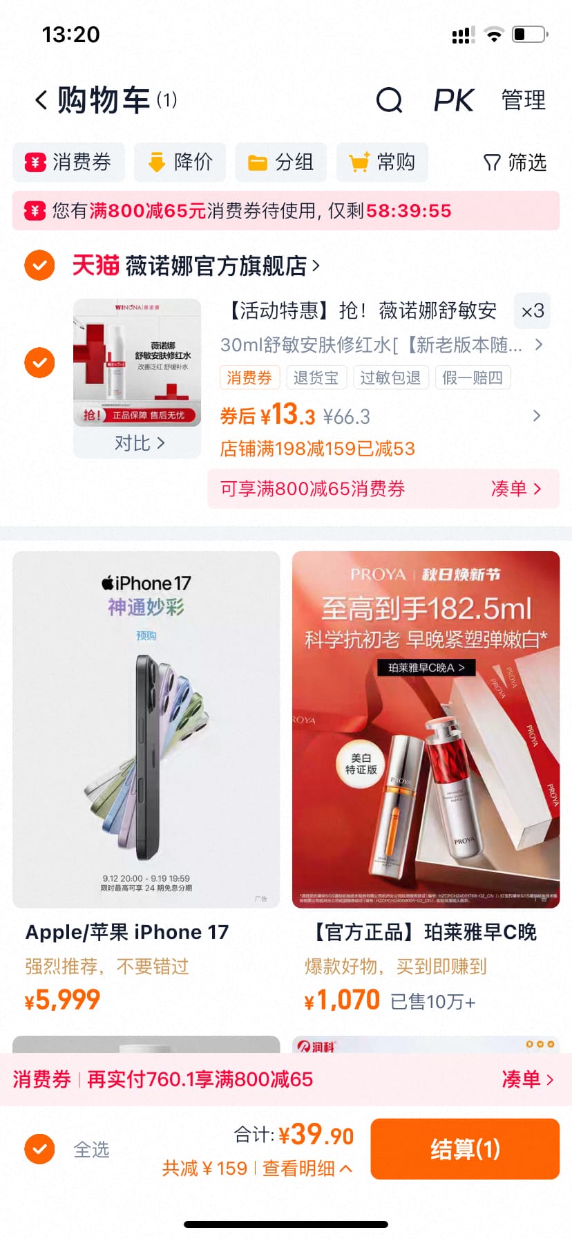 薇诺娜舒敏安肤修红水 买3件 到手39.9