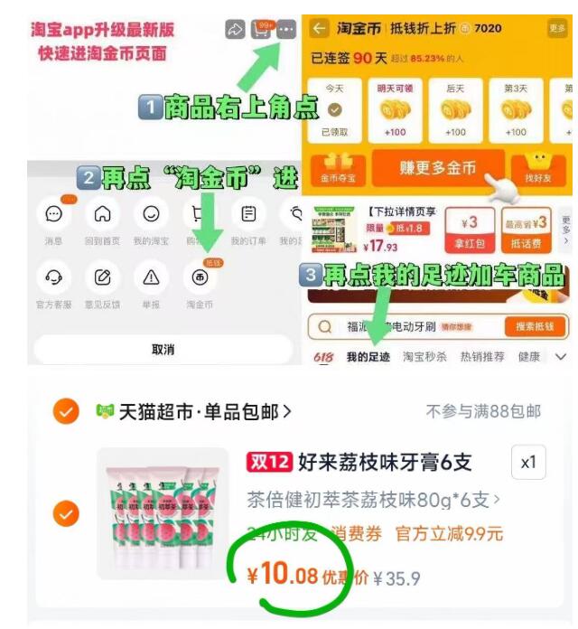 1.6/支的好来牙膏 好来荔枝味牙膏80g*6到手10 ☀88叠标题下5元福袋才对 - 注意:商品右上角3个点,选淘金币 再选 我的足迹-找到商品拍下